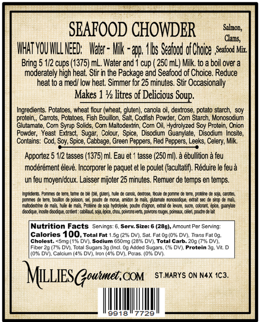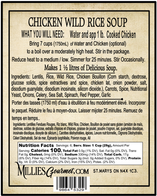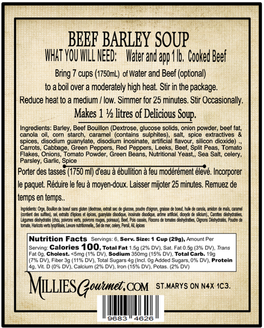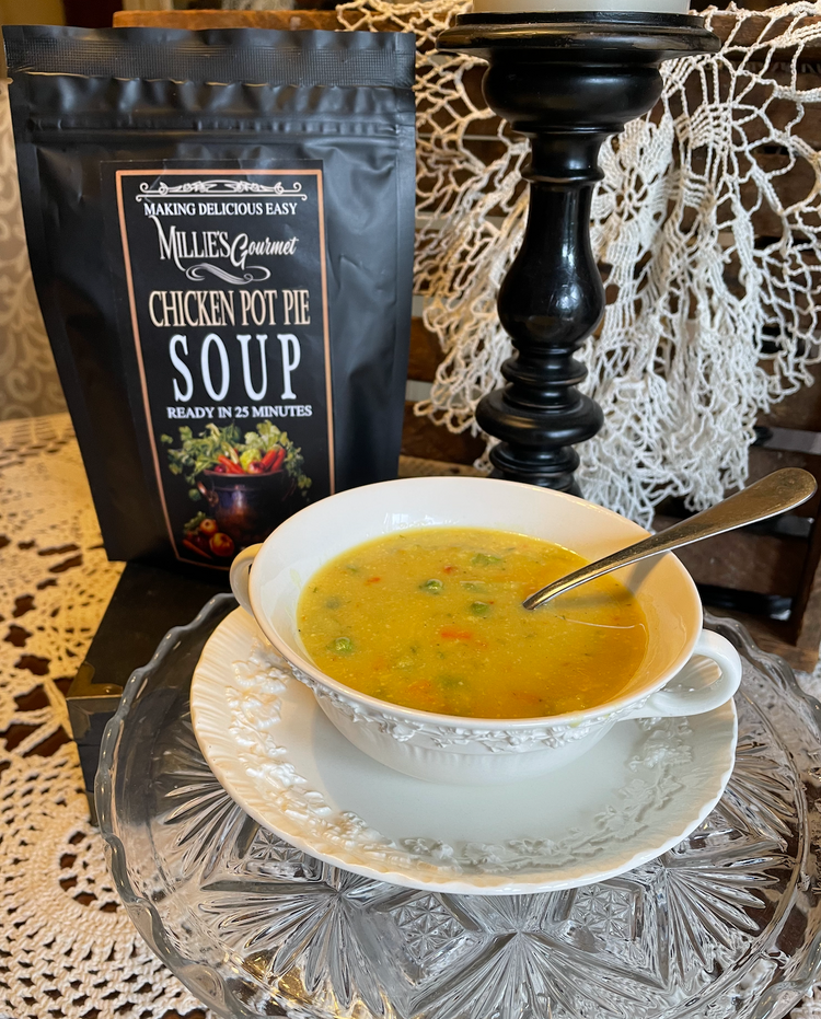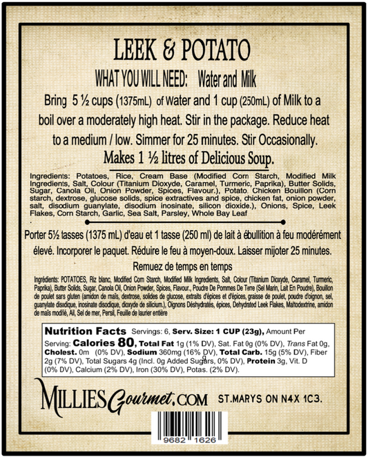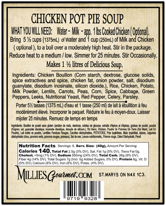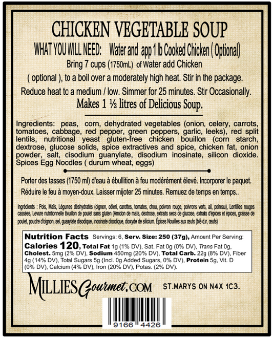 This is where it all started for Millie's Gourmet—a commitment to quality, taste, and the joy of sharing good food. Our promise to you is a delicious experience that takes all the work out of making a great pot of soup. Each package is thoughtfully prepared to make 1.5 liters of heartwarming goodness, ensuring you have a delightful, homemade meal ready in minutes. Just add liquid and meat if you choose. Ready in 25 minutes.