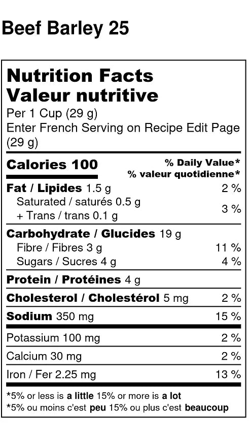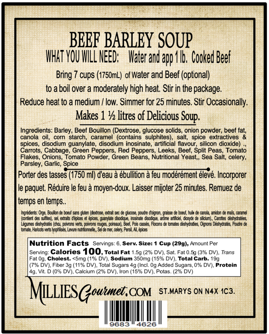 Barley, Beef Bouillon (Dextrose, glucose solids, onion powder, beef fat, canola oil, corn starch, caramel (contains sulphites), salt, spice extractives & spices, disodium guanylate, disodium inosinate, artificial flavour, silicon dioxide) ., Carrots, Cabbage, Green Peppers, Red Peppers, Leeks, Beef, Split Peas, Tomato Flakes, Onions, Tomato Powder, Green Beans, Nutritional Yeast,, Sea Salt, celery, Parsley, Garlic, Spice.