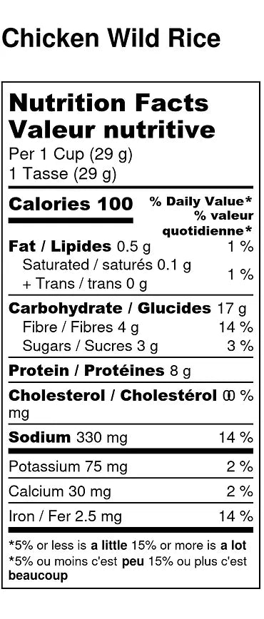 Ingredients: Lentils, Rice, Wild Rice, Chicken, dextrose, glucose solids, chicken fat, disodium guanylate, disodium inosinate, silicon dioxide.), Spice, Carrots, Nutritional Yeast, Onions, Celery, Spinach, Red Pepper, Garlic.