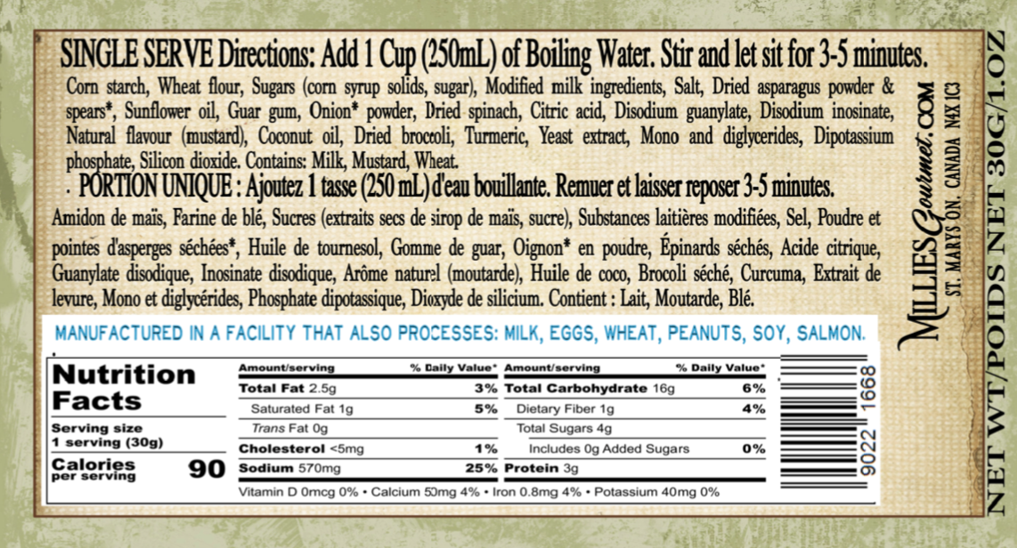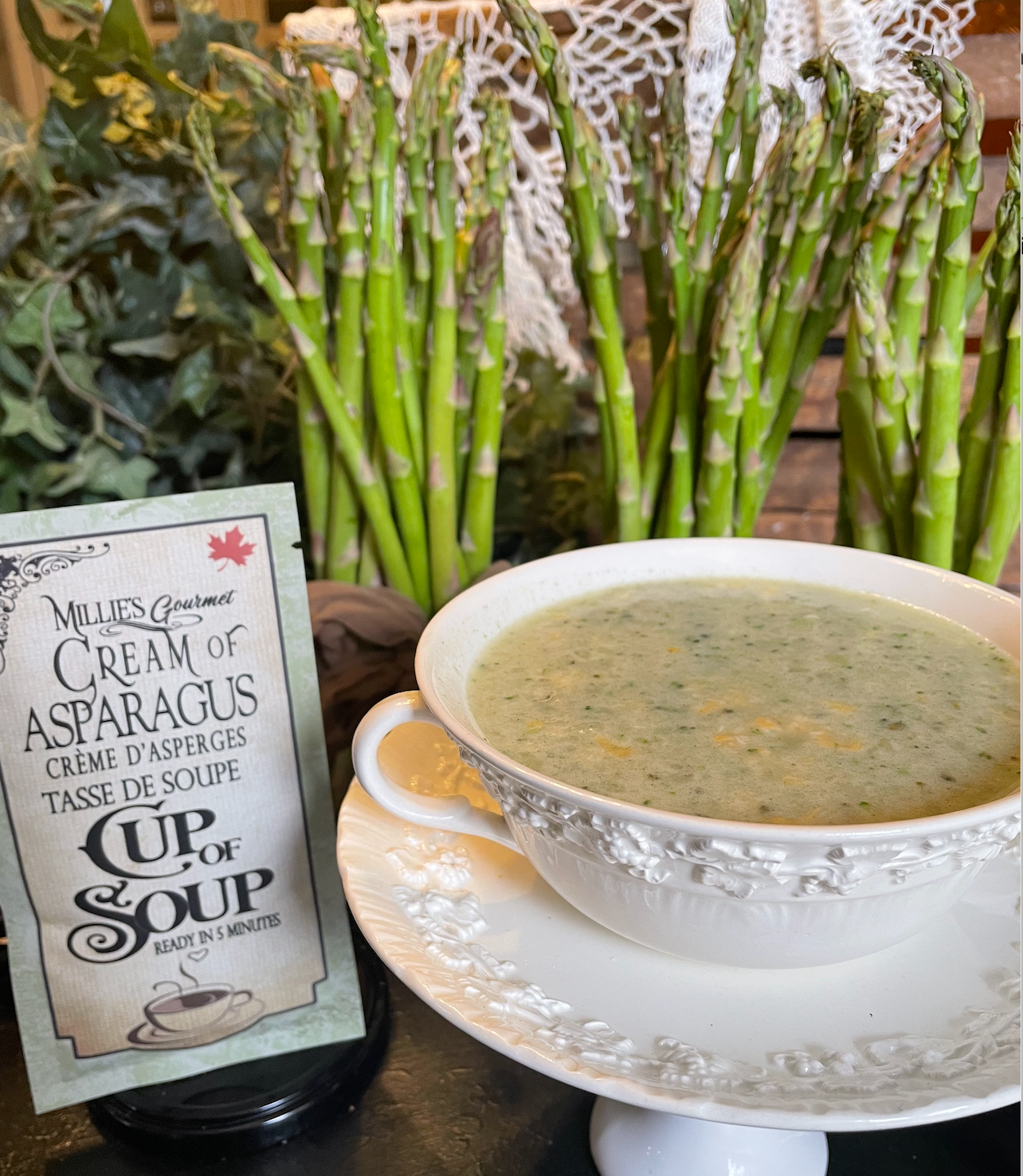 Handcrafted in small batches, Millie's Gourmet Asparagus Cup of Soup captures the essence of homemade goodness in a convenient package. With each sip, you'll experience the rich flavors and wholesome goodness that only a carefully crafted soup can provide. Perfect for a quick lunch at the office or a cozy meal at home, this soup is a versatile and delicious choice for any occasion Just add boiling water, stir, let sit. Ready in 5 minutes.