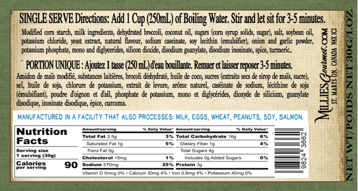 At Millie's Gourmet, we understand the value of convenience without compromising on taste. Our broccoli cup of soup is a testament to that belief - a delicious and nutritious option that's ready in just 5 minutes. Perfect for those busy days when you need a quick and satisfying meal, our soup is crafted with care and expertise to bring you a homemade goodness experience in a convenient package. Just add boilng water, stir, let sit. Ready in 5 minutes.