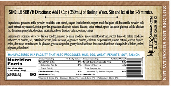 Ingredients: potatoes, milk powder, potatoes, modified corn starch, sugars ( maltodextrin, sugar), modified palm oil, buttermilk powder, salt, yeast extract, soybean oil, onion powder, potassium chloride, natural flavour, spice extract. spice, dextrose, glucose solids, chicken fat, disodium guanylate, disodium inosinate, silicon dioxide.), celery, onions, chives.