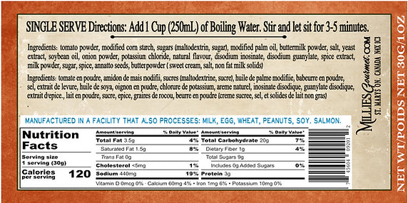 Millie's Gourmet presents its delectable Creamy Tomato Cup of Soup, a comforting blend of rich, velvety tomato goodness that warms the soul with every spoonful. Crafted with care in small batches, this soup embodies the essence of homemade comfort and gourmet quality. Each sip is a symphony of flavors, carefully balanced to deliver a taste sensation that is both familiar and exciting. Just add boiling water, stir, let sit ready in 5 minutes.