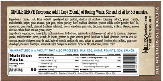 Our French Onion Cup of Soup has the distinct flavour that comes from the combination of caramelized onions, beef broth, and a variety of seasonings, dressed with Parmesan Cheese & Panko Crumbs to give you the flavours you can expect in a traditional French Onion Soup. Just add boiling water. Ready in 5 minutes. Enjoy!