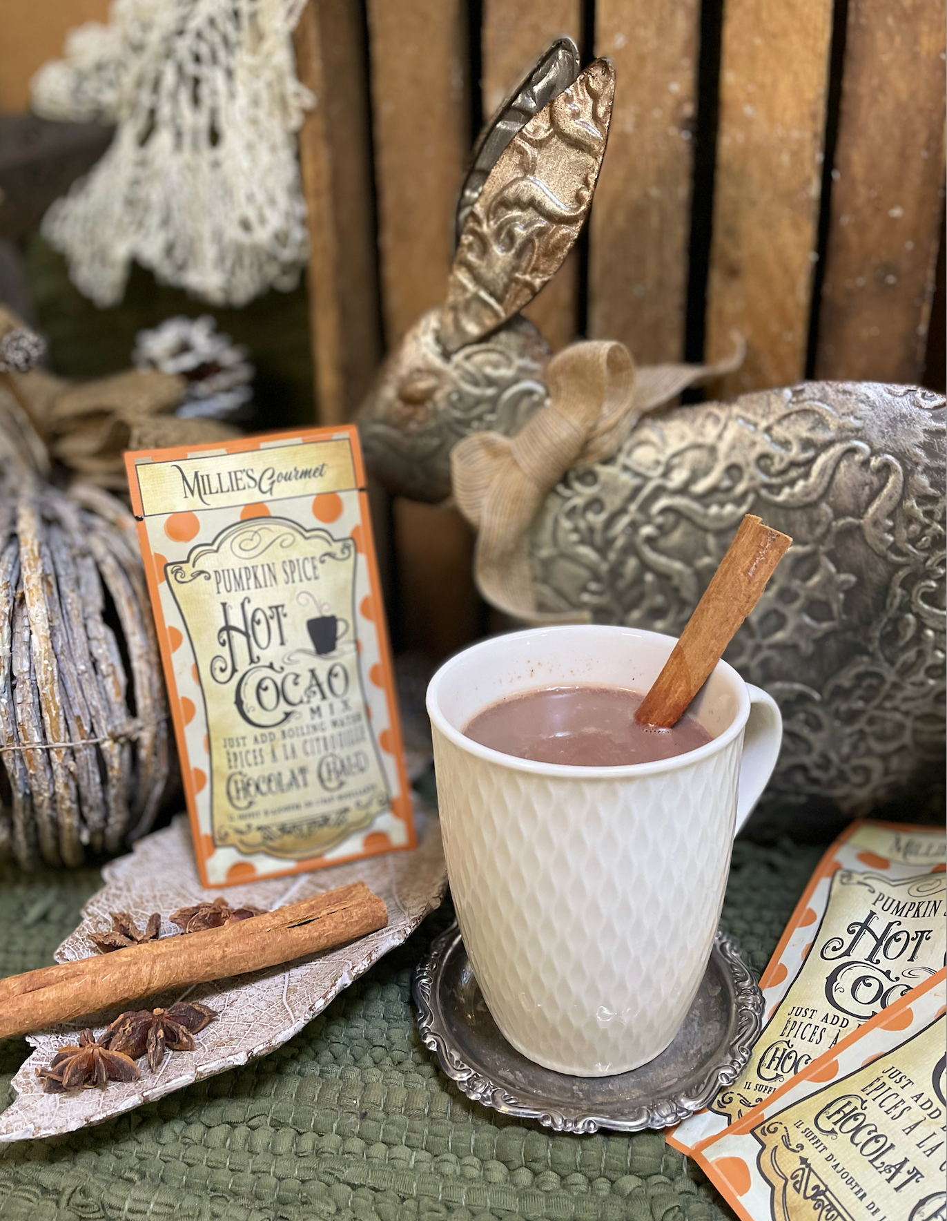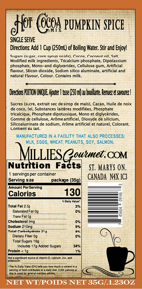 Warm up to the cozy flavours of fall with Millie's Gourmet Pumpkin Spice Hot Chocolate. Our small-batch blend combines rich, velvety chocolate with the perfect hint of pumpkin spice, creating a comforting beverage that's as delightful as a homemade treat. Sip, savor, and enjoy the taste of autumn in every cup.