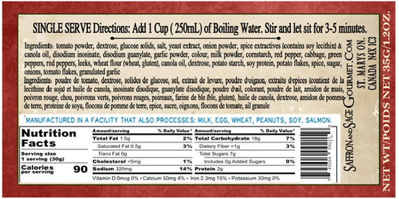 Ingredients: tomato powder, dextrose, glucose solids, salt, yeast extract, onion powder, spice extractives (contains soy lecithin) & spice, canola oil, disodium inosinate, disodium guanylate, garlic powder, colour., milk powder, cornstarch, red pepper, cabbage, green peppers, red peppers, leeks, wheat flour (wheat, gluten), canola oil, dextrose, potato starch, soy protein, potato flakes, spice, sugar, onions, tomato flakes, granulated garlic.