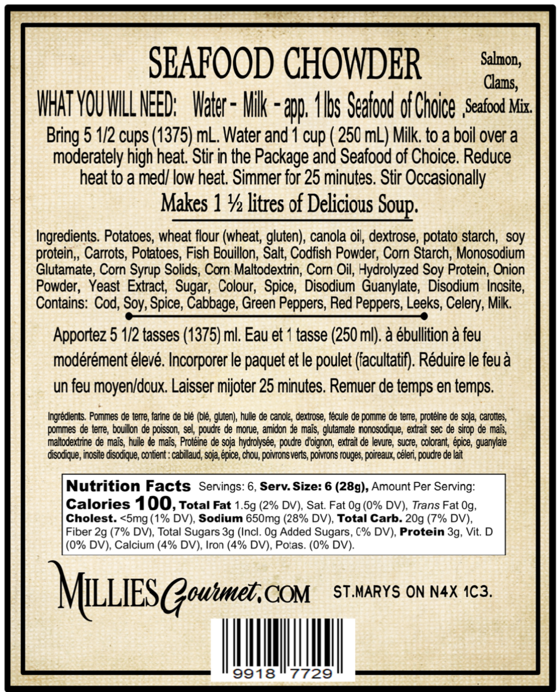 Ingredients: Potatoes, wheat flour (wheat, gluten), canola oil, dextrose, potato starch, soy protein, Carrots, Potatoes, Fish Bouillon, Salt, Codfish Powder, Corn Starch, Monosodium Glutamate, Corn Syrup Solids, Corn Maltodextrin, Corn Oil, Hydrolyzed Soy Protein, Onion Powder, Yeast Extract, Sugar, Colour, Spice, Disodium Guanylate, Disodium Inosite, Contains Cod, Soy, Spice, Cabbage, Green Peppers, Red Peppers, Leeks, Celery, Milk Powder.