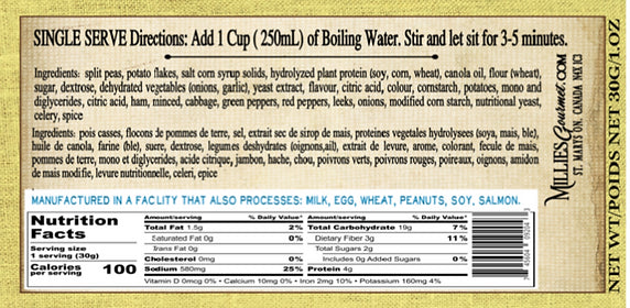 ingredients: split peas, potato flakes,, c-salt, corn syrup solids, hydrolyzed plant protein (soy, corn, wheat), canola oil, flour (wheat), sugar, dextrose, dehydrated vegetables (onions, garlic), yeast extract, flavour, citric acid, colour., cornstarch, potatoes, mono and diglycerides, citric acid., ham, minced, cabbage, green peppers, red peppers, leeks, onions, modified corn starch, nutritional yeast, celery, spice