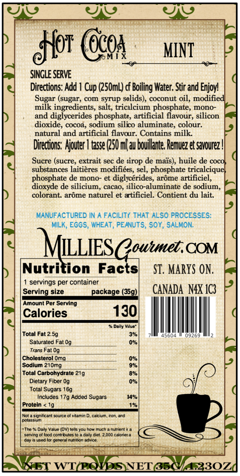 *Warm Up with Millie's Mint Hot Chocolate Blend** Indulge in the perfect blend of rich chocolate and refreshing mint. Our Mint Hot Chocolate Blend is crafted in small batches to ensure every cup brings a touch of homemade goodness. Cozy up and treat yourself to a deliciously Canadian delight.