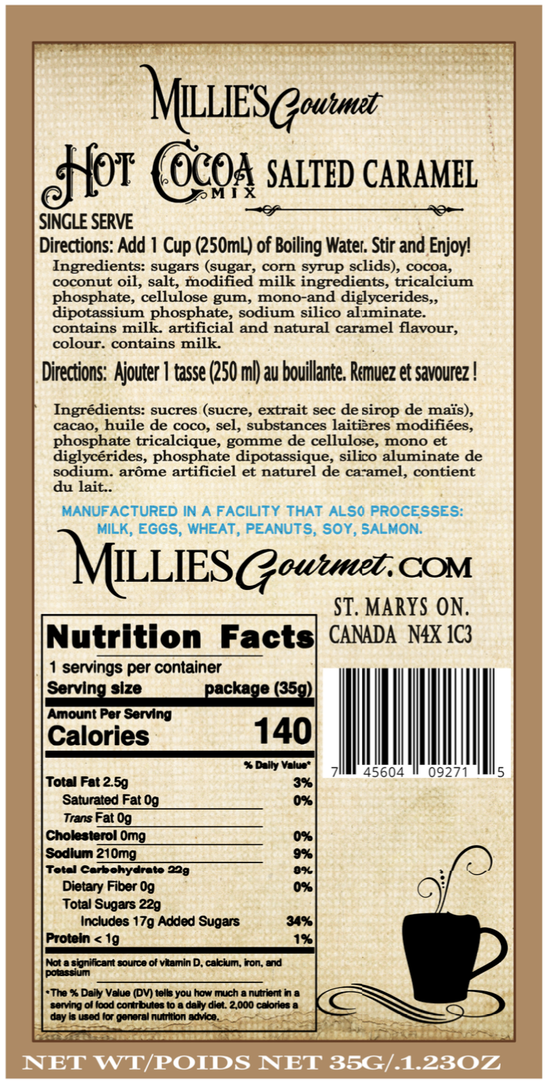 Indulge in the rich, velvety experience of Millie's Gourmet Salted Caramel Hot Chocolate Mix. Crafted in small batches with the finest ingredients, this decadent treat brings the perfect balance of sweet caramel and a hint of sea salt to your cup. Sip, savor, and enjoy a touch of homemade goodness in every sip.