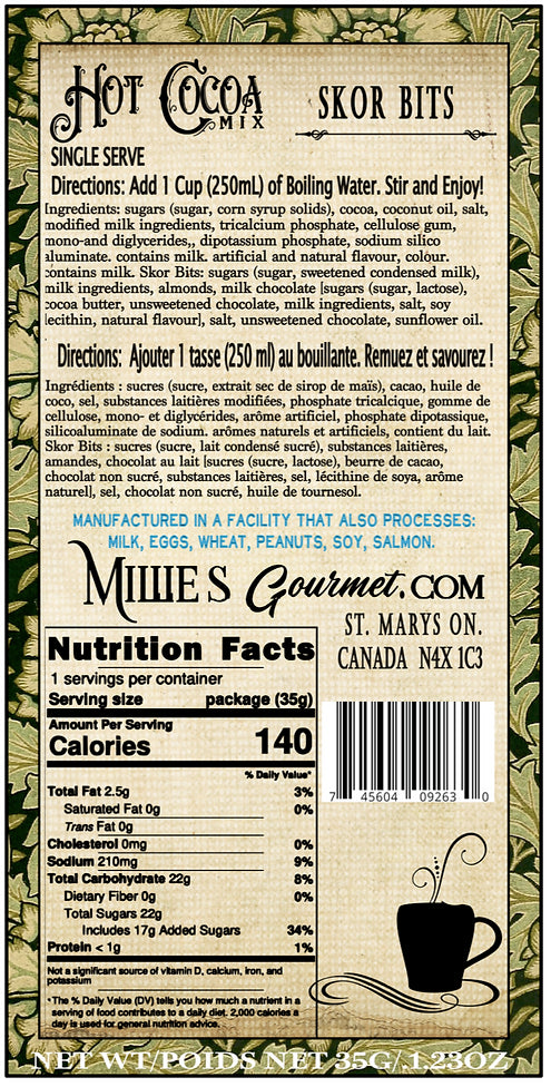 Warm up your winter with Millie's Gourmet Hot Chocolate blend with Skor Bits. Indulge in the rich, creamy taste of premium cocoa, perfectly complemented by the irresistible deliciousness of Skor toffee bits. Crafted in small batches for that homemade touch, this hot chocolate is a cozy treat that brings a little luxury to every sip. Enjoy a taste of Canadian goodness in every cup.